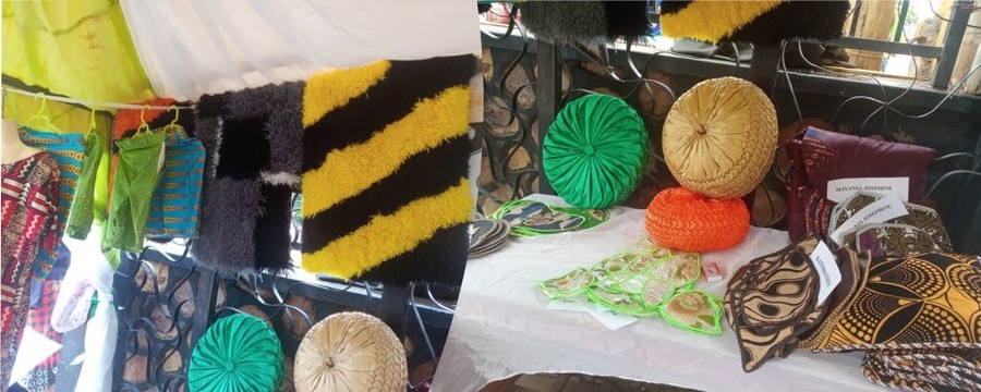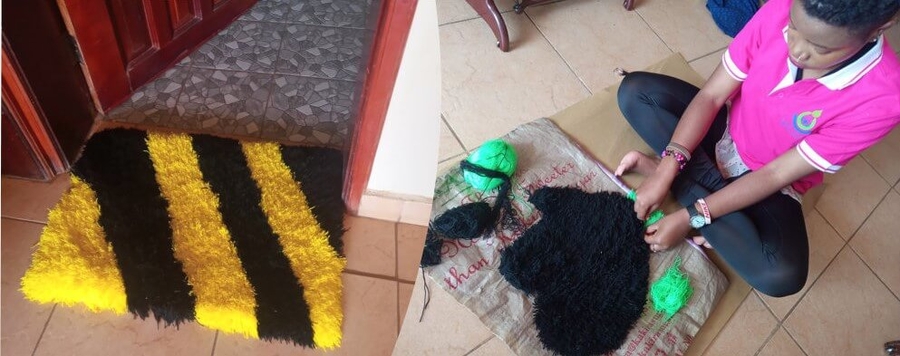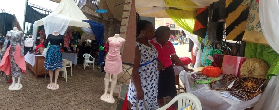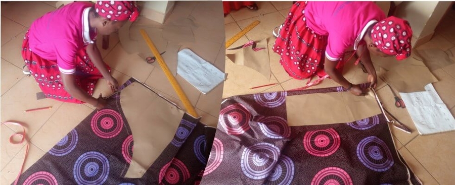 A fashion designing student cutting out her drafted skirt pattern on African fabric using drafting paper
